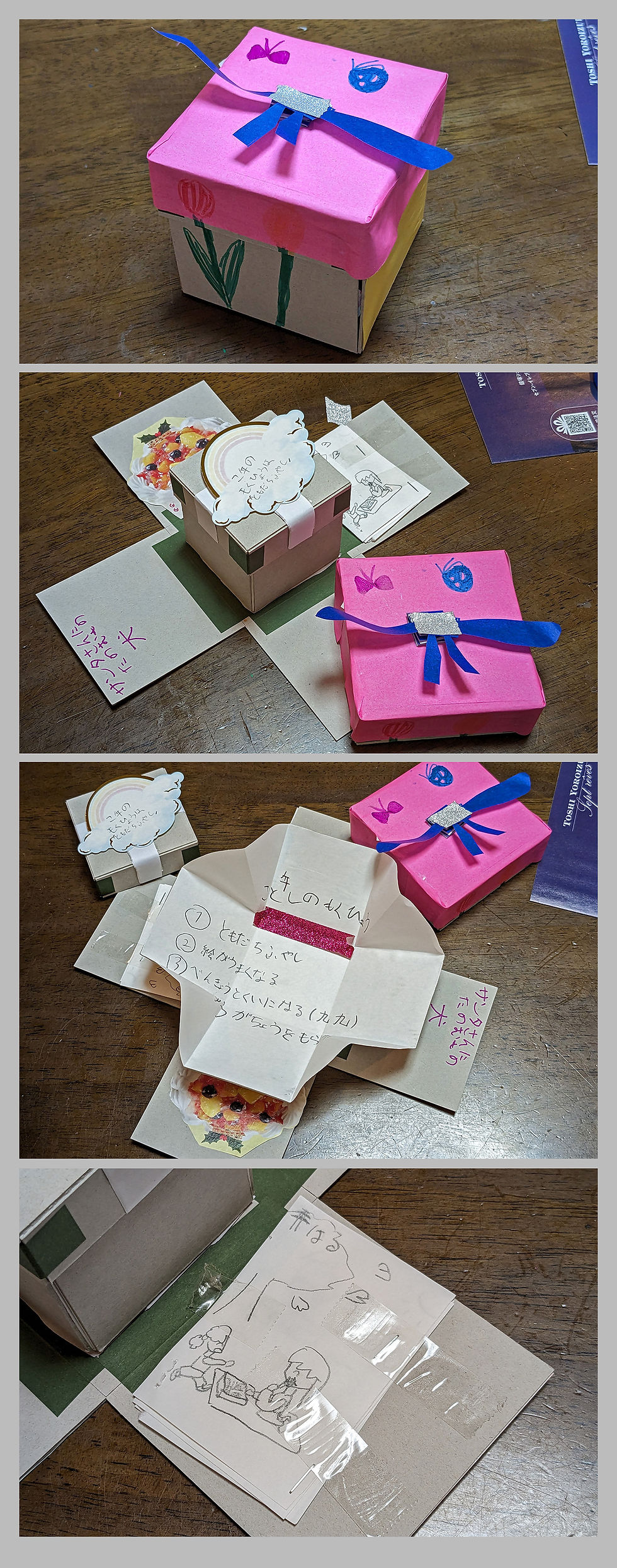 ギフトボックス馬場 桜2023年12月4日読了時間: 1分更新日:2024年5月6日ボックス型のクリスマスカードを作りました。みんながクリスマスのボックスを作る中、一足早く春のボックスを作っている人が居ました。春に思いを寄せての力作のミニ絵本もついてて素敵でした。写真を撮れなかった作品もありましたが、みんな本当に素敵でした。